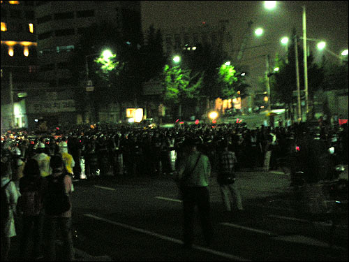Áýȸ¸¦ ¸¶¹«¸® Áþ°í ¾È±¹¿ª ÂÊÀ¸·Î ÇàÁøÀ» ÇÏ¿´½À´Ï´Ù. ¾È±¹¿ªÂÊÀ¸·Î °¡´Â ±æ¿¡ Á¶°è»ç¿¡ µé·¯ ¼ö¹èÁßÀÎ ´ëÃ¥À§ °£ºÎµé¿¡°Ô ÈûÀ» ³»¶ó´Â °Ý·ÁÀÇ Àλ縦 ÀüÇÏ°í ´Ù½Ã Ã»¿Í´ë·Î ÇàÁøÀ» °è¼ÓÇÏ¿´½À´Ï´Ù. ¾È±¹¿ªÀ» Áö³ª µ¿½ÊÀÚ°¢¿¡ À̸£´Ï, °æÂûµéÀÌ Àü°æ¹ö½º·Î ²Ë ¸·¾Æ ¹ö¸®°í ÇàÁøÀ» ¸·¾Æ³õ¾Ò½À´Ï´Ù. ±× ¾Õ¿¡¼ ´ë¿À´Â ±¸È£¸¦ ¿ÜÄ¡°í ³ë·¡¸¦ ºÒ·¶½À´Ï´Ù.