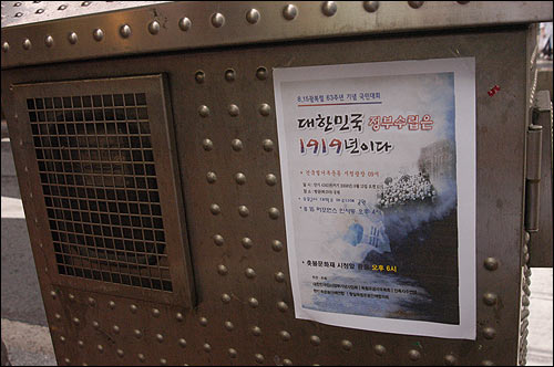 ¡â °Å¸® °÷°÷¿¡ ºÎÂøµÈ '´ëÇѹα¹ Á¤ºÎ¼ö¸³Àº 1919³âÀÌ´Ù'¶ó´Â Æ÷½ºÅͰ¡ À̸í¹ÚÁ¤ºÎÀÇ '°Ç±¹ 60ÁÖ³â Çà»ç'¸¦ ºñ²¿°í ÀÖ´Ù.