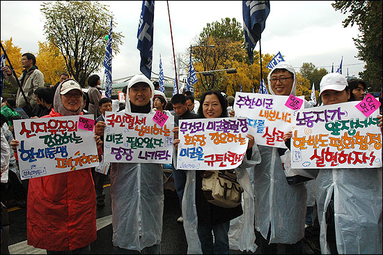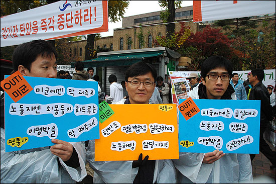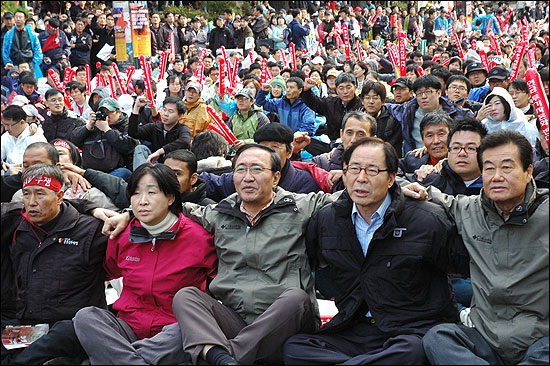 °æÁ¦À§±â¿Í ¹Î»ýÆÄźÀ» Ã˹߽Ã۰í ÀÖ´Â À̸í¹Ú Á¤ºÎ¿¡ ´ëÇÑ ½ÉÆÇ°ú ´õºÒ¾î Á¤ºÎ ½ÅÀÚÀ¯ÁÖÀÇ ½ÃÀåÈ Á¤Ã¥ Àü¸é Æó±â, ºñÁ¤±ÔÁ÷ ¹®Á¦ ÇØ°áÀ» ÅëÇÑ ¾ç±ØÈ ÇØ°á µî ¹Î»ý »ì¸®±â¸¦ À§ÇÑ ³ëµ¿ÀÚ ¿ä±¸¿Í °áÀǸ¦ ¹àÈ÷´Â ÅõÀïÀÇ ÀÚ¸®¿´´Ù.