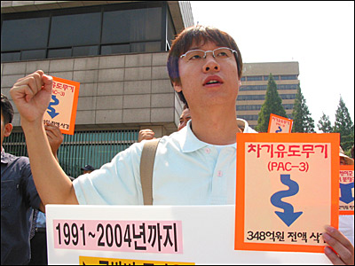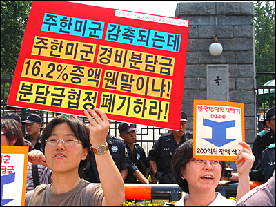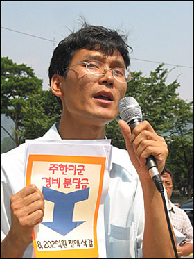 'ÁÖÇѹ̱º °æºñ Áö¿ø±ÝÀÎ ¹æÀ§ºñ ºÐ´ã±Ý Ưº°ÇùÁ¤ Æó±âÇ϶ó'´Â ³»¿ëÀ¸·Î ¸¶Áö¸· Á¤Ä¡¿¬¼³¿¡ ³ª¼± ÆòÅë»ç °øµ¿±æ ÆòȱºÃà ÆÀÀåÀº "'ÇÑ¹Ì¼ÒÆÄ 5Á¶¿¡ ´ëÇÑ Æ¯º°Á¶Ä¡ÇùÁ¤'À¸·Î óÀ½ ³»±â ½ÃÀÛÇÑ ÁÖÇѹ̱º °æºñ ºÐ´ã±ÝÀº 91³â 1¾ï 5õ¸¸ ´Þ·¯¿¡¼ ±×»çÀÌ ´«µ¢ÀÌó·³ ºÒ¾î³ª ¿ÃÇØ¿¡´Â 6¾ï2õ¸¸ ´Þ·¯ 7,469¾ï¿ø)¿¡ À̸£°í ÀÖ´Ù. ±×¸®°í 91³âºÎÅÍ 2002³â±îÁö Çѱ¹ÀÇ ±¹¹æºñ Áõ°¡À²ÀÌ 119%Àε¥ ¹ÝÇØ ÁÖÇѹ̱º °æºñ ºÐ´ã±Ý Áõ°¡À²Àº ¹«·Á 634%¿´´Ù´Â »ç½ÇÀº ÁÖÇѹ̱º °æºñ ºÐ´ã±ÝÀÌ ±¹¹æºñ´Â ¹°·ÐÀÌ°í ¿ì¸® ±¹°¡ ÀçÁ¤¿¡ ¾ó¸¶³ª ºÎ´ãÀ» °¡Áß½ÃÄÑ ¿Ô´Â°¡¸¦ ´ÜÀûÀ¸·Î ¸»ÇØ ÁØ´Ù"¸ç ¹æÀ§ºñ ºÐ´ã±ÝÀÇ ºÎ´ç¼ºÀ» Á¦±âÇß´Ù.