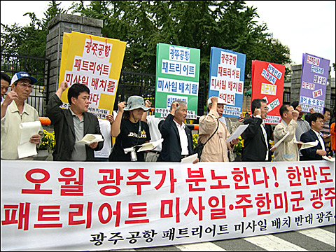 ÀÌ¾î¼ ±èº´±Õ ±¤ÁÖÀü³²°ø´ëÀ§ »óÀÓ´ëÇ¥Àº "ÁÖÇѹ̱ºÀÌ ÆÐÆ®¸®¾îÆ® ¹Ì»çÀϰú ÁÖÇѹ̱ºÀ» ±¤ÁÖ¿¡ ¹èÄ¡Çϰڴٴ °ÍÀº ¿À¿ù Á¤½ÅÀ» ÈѼÕÇÏ°í ±¤ÁÖ ½Ã¹ÎÀ» ºÐ³ëÄÉ ÇÏ´Â °ÍÀÏ »Ó ¾Æ´Ï¶ó ÀÚÁÖ¿Í Æòȸ¦ ¹Ù¶ó´Â ±¹¹ÎÀû ¿°¿ø¿¡ Âù¹°À» ³¢¾ñ´Â ÇàÀ§"¶ó¸ç ¹Ì±¹À» °·ÂÈ÷ ±ÔźÇϰí "¹Ì±¹ÀÌ ±¤ÁÖ¿¡ ÆÐÆ®¸®¾îÆ® ¿©´ÜÀ» ¹èÄ¡ÇϰíÀÚ ÇÏ´Â °ÍÀº ´ëºÏ.´ëÁß±¹À» °Ü³ÉÇÑ °ÍÀ¸·Î Çѹݵµ¿Í µ¿ºÏ¾ÆÀÇ ±º»çÀû ±äÀåÀ» Á¶¼ºÇÏ´Â °ÍÀÏ »Ó ¾Æ´Ï¶ó ³²ÇÑÀ» MDüÁ¦¿¡ ÆíÀÔ½Ã۰íÀÚ ÇÏ´Â °ÍÀ¸·Î ÀÌ´Â °áÄÚ ¿ë³³µÉ ¼ö ¾ø´Â ¹üÁËÇàÀ§°¡ ¾Æ´Ò ¼ö ¾ø´Ù"¸ç "¿Â ±¹¹ÎÀÇ ³ª¼¼ ±¤ÁÖ ÆÐÆ®¸®¾îÆ® ¿©´Ü ¹èÄ¡¸¦ ¸·¾Æ³»°í, ±×·± ±â¼¼·Î ¿ë»ê, ÆòÅà ÅõÀïµµ ½Â¸®ÇØ ³ª°¡ÀÚ"°í ÈûÁÖ¾î ¸»¾¸Çϼ̽À´Ï´Ù.