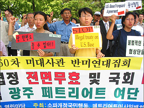 Áýȸ Âü°¡ÀÚµéÀº ÆòÅÃ, ±¤ÁÖ, ¾È¾ç µî ÀÌ ¶¥ °÷°÷¿¡¼ ÁÖÇѹ̱º¿¡ ÀÇÇÑ °¢Á¾ ÇÇÇØ¸¦ ´çÇÏ´Â ÁֹεéÀÇ ÇDzú´Â ¸ñ¼Ò¸®¸¦ µéÀ¸¸é¼ ´Ù½Ã Çѹø ±»Àº °áÀǸ¦ ´ÙÁ³½À´Ï´Ù. ºÒ¹ýÀûÀÎ ¿ë»ê±âÁö ÀÌÀüÇùÁ¤ Àü¸é¹«È¿¿Í ±¹È¸ ºñÁØÀ» ÀúÁöÇϰí, ÆòÅà ¹Ì±º±âÁö È®ÀåÀ» Áö¿ª Áֹεé°ú ¿¬´ëÇØ¼ ¸·¾Æ³»°í, 5¿ù Á¤½ÅÀÌ »ì¾ÆÀÖ´Â ±¤ÁÖ ¶¥¿¡ ´Ü ÇÑ ±âÀÇ ÆÐÆ®¸®¾îÆ® ¹Ì»çÀϵµ ´Ü ÇѸíÀÇ ÁÖÇѹ̱ºµµ ¿ÀÁö ¸øÇϵµ·Ï ¸¸µé °ÍÀ̸ç, ÁÖÇѹ̱ºÀÌ ÀÌ ¶¥À» ¿À¿°½ÃŰ´Â ÁÖÇѹ̱º ¼ÛÀ¯°üÀ» Æó¼âÇϰí ȯ°æ ÇÇÇØ¿¡ ´ëÇÑ ¹è»ó°ú º¹±¸¸¦ Çϵµ·Ï ÅõÀïÇØ ³ª°¥ °ÍÀ» ¼·Î¿¡°Ô ¾à¼ÓÇß½À´Ï´Ù.
