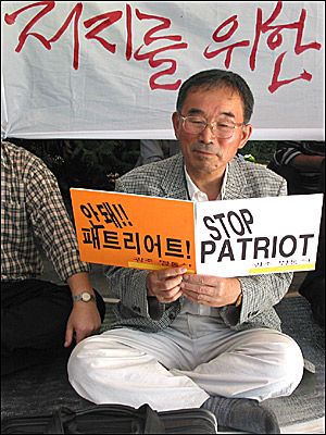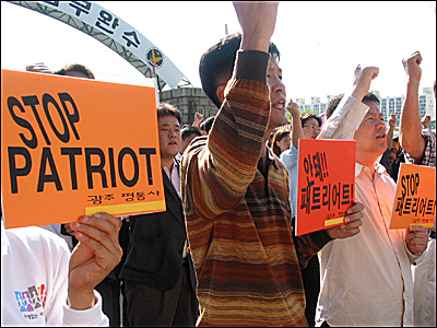 ¡â°ø±ºÁ¦1ÀüÅõºñÇà´Ü Á¤¹® ¾Õ¿¡¼ ¹Ì±º ÆÐÆ®¸®¾îÆ® ¹Ì»çÀÏ ºÎ´ë ¹èÄ¡¿¡ ¹Ý´ëÇÏ´Â ±âÀÚȸ°ßÀ» °®°í ÀÖ´Â ±¤ÁÖÀü³² °ø´ëÀ§ ȸ¿øµé.