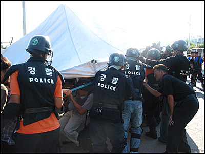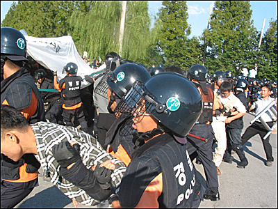 õ¸·³ó¼º¿¡ µé¾î°£Áö 30ºÐÂë Áö³µÀ» ¶§ °æÂûÀº õ¸·¼³Ä¡´Â ºÒ¹ýÀ̶ó¸ç °æ°íÇÏ´õ´Ï ¼ö¹é¸íÀÌ ´Þ·Áµé¾î õ¸·À» »¯¾î°¬´Ù. ÀÌ °úÁ¤¿¡ °æÂû°ú ³ó¼ºÀڵ鰣¿¡ ½ÉÇÑ ¸ö½Î¿òÀÌ ¹ú¾îÁ³´Ù. õ¸·À» »¯¾î°£ °æÂûµéÀº ÀÌÁ¦ ³ó¼ºÀÚµéÀ» ¹æÆÐ·Î ¹Ð¾îºÎÄ¡±â ½ÃÀÛÇß´Ù. õ¸·¼³Ä¡°¡ ºÒ¹ýÀ̶ó¸ç õ¸·À» »¯¾î°¡´õ´Ï ÀÌÁ¦´Â ¾Æ¿¹ ÇÕ¹ýÀûÀ¸·Î ½Å°íµÈ ÁýȸÁ¶Â÷ ºÒ¹ý ź¾ÐÀ» ÀÚÇàÇÏ¿´´Ù. ³ó¼ºÀÚµéÀº µå·¯´©¿ö ³ó¼ºÀåÀ» »ç¼öÇÏ¿´°í ±×Á¦¼¾ß °æÂûÀº ÀϺÎÁö¿ª¿¡¼ Áýȸ¸¦ º¸ÀåÇÏ¿´´Ù.